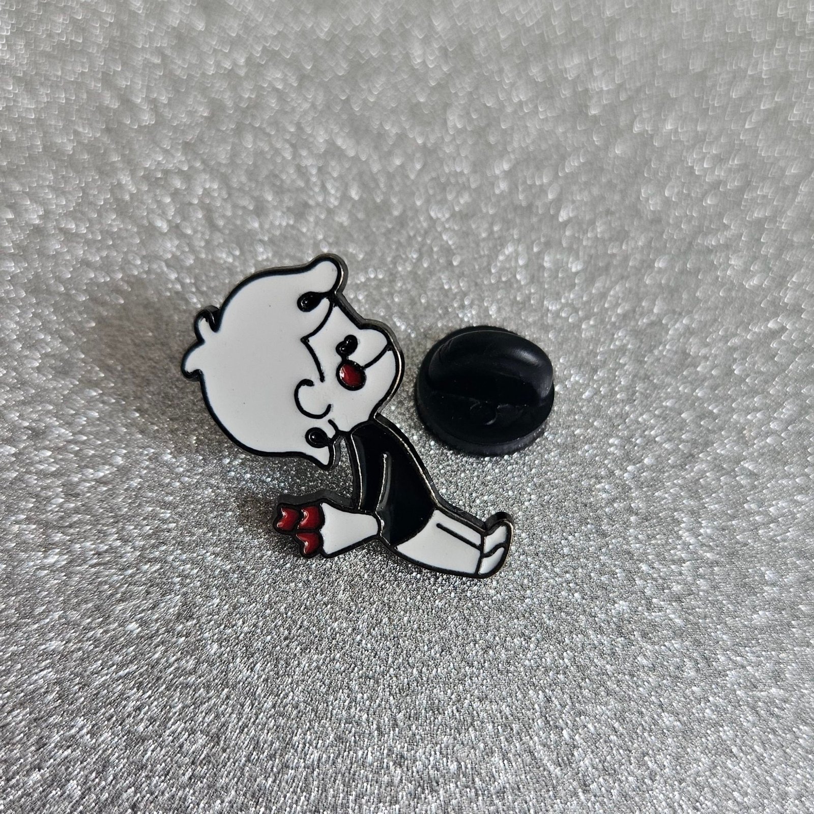 Šio emalio segtuko dizainas yra išskirtinis ir nostalgiškas. Balta, juoda ir raudona spalvų paletė primena senąją animaciją, o cute skruostai ir gėlė sukuria mielą, bet šiek tiek edgy kontrastą. Šis anime segtukas puikiai tinka derinti su kitais pop culture ar romantiškos tematikos pin’ais.