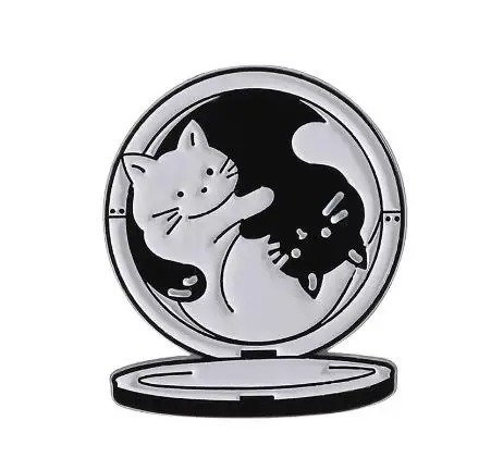 Šio emalio segtuko dizainas išsiskiria minimalistiniu, bet tuo pačiu metu – mielu stiliumi. Juoda ir balta spalvų schema yra lengvai derinama prie bet kokios aprangos, nuo oversized hoodie iki elegantiško švarko. Kačių formos yra cute ir kawaii, o tai suminkština filosofinio simbolio rimtumą. Šis kačių segtukas puikiai tinka derinti su kitais gyvūnų ar Azijos tematikos pin’ais.
