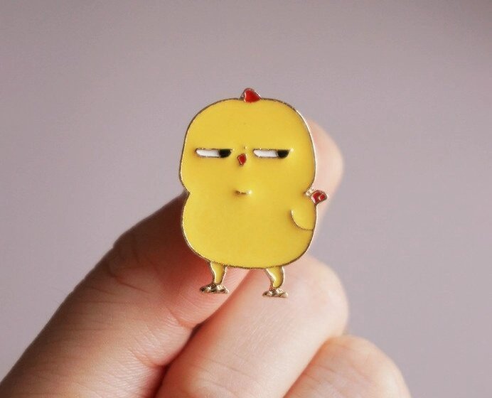 Šio emalio segtuko kūrėjai sugebėjo minimaliomis priemonėmis perteikti maksimalią emociją. Kontrastas tarp mielo paukštelio formos ir jo sarkastiško žvilgsnio sukuria unikalų estetinį vaizdą. Šis viščiuko pin’as puikiai tinka prie laisvalaikio drabužių, suteikdamas jiems drąsaus ir modernaus charakterio.