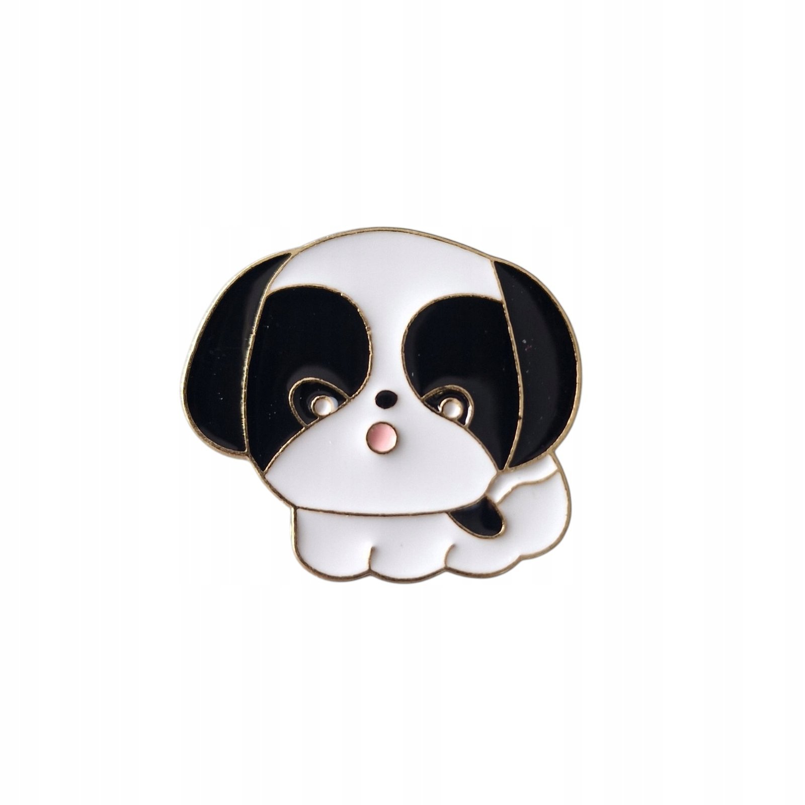 Be galo mielas emalio *pin’as*. Animacinis, juodai baltas šuniukas – puikus aksesuaras tiems, kurie myli kawaii estetiką, gyvūnus ir vertina fun stilių.